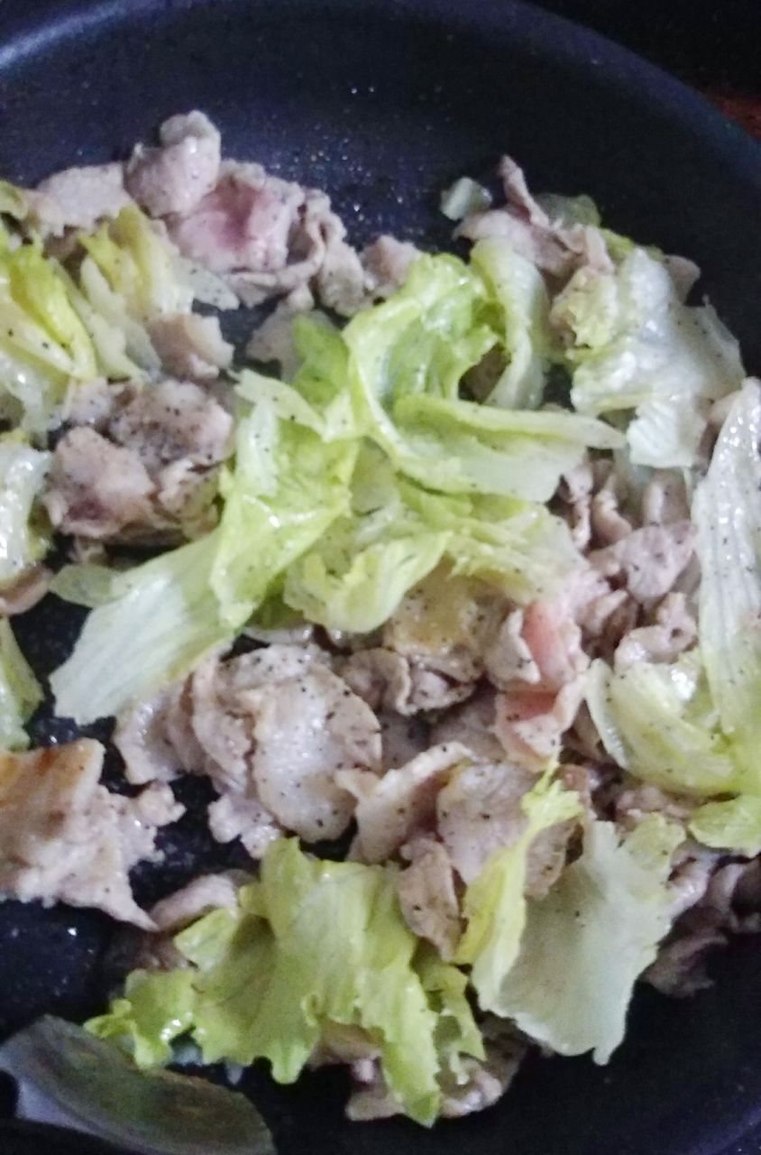 ん?。。、。かしまし🐷豚、。レタス炒め。。ん。。、。美味しいそゥ♪。。、。た、食べた~ィ♪(>_<)💦💦ごま油使うトコがポイントですネ⭐。。、。